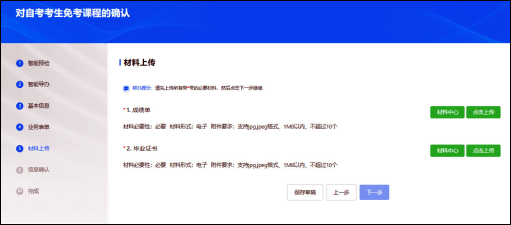 5.点击“下一步”按钮,进入材料上传页面(如下图),请点击绿色的“点击上传”按钮,按照要求上传对应的材料图片,图片支持JPG、JPEG格式,图片清晰、文件大小须在1MB以内。