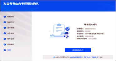 6.完成材料上传后,点击“下一步”按钮进入信息确认页面,考生检查确认后提交最终的免考申请,出现“申请提交成功”页面后(如下图),办理完成。